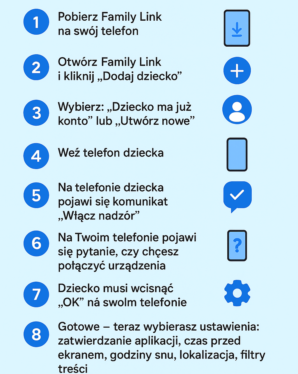 Family Link działa jak inteligentny autopilot dla cyfrowego świata dziecka: prosty, darmowy i skuteczny. Pomaga pilnować bezpieczeństwa, jednocześnie ucząc samodzielności. To nie jest cyfrowy kaganiec — to mądre wsparcie, które chroni, ale nie ogranicza rozwoju.